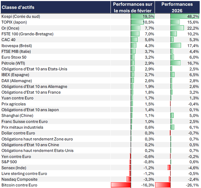 Une fois n’est pas coutume, les marchés actions mondiaux, en février, n’ont pas eu besoin des marchés actions américains pour progresser, bien au contraire. Le S&P 500 (-0.8%) et le Nasdaq (-3.3%) affichent de tristes performances.