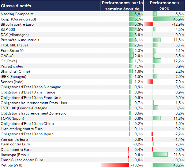 Les marchés vont ouvrir en baisse ce matin, à 48 heures de la fin théorique du cessez-le-feu et en raison du refus des Iraniens, selon les dernières informations, de se rendre à Islamabad pour un deuxième round de discussions. La baisse semble toutefois devoir rester limitée de même que la progression du prix du pétrole est relativement contenue ce matin (+6% à 95 $ pour le WTI). Les investisseurs font en effet le pari de la négociation. Les marchés retiennent, comme nous, que les deux parties veulent et surtout ont besoin de sortir de ce conflit.